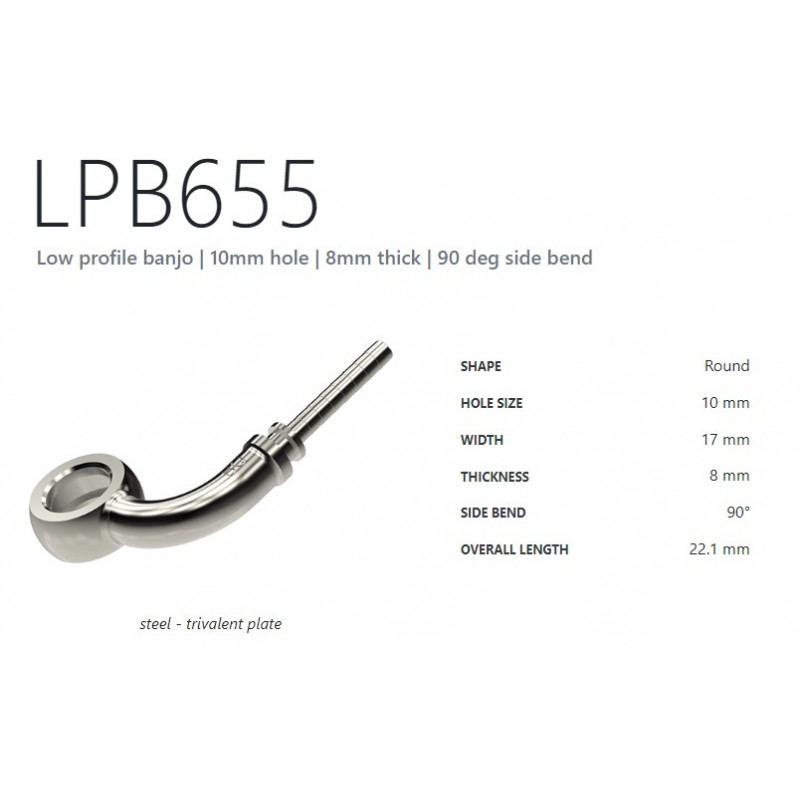 Oko pro použití s nerez. oplet. hadicemi. Otvor 10 mm. Šířka 18 mm. Výška 10 mm. Ohyb 90° Délka 23 mm.