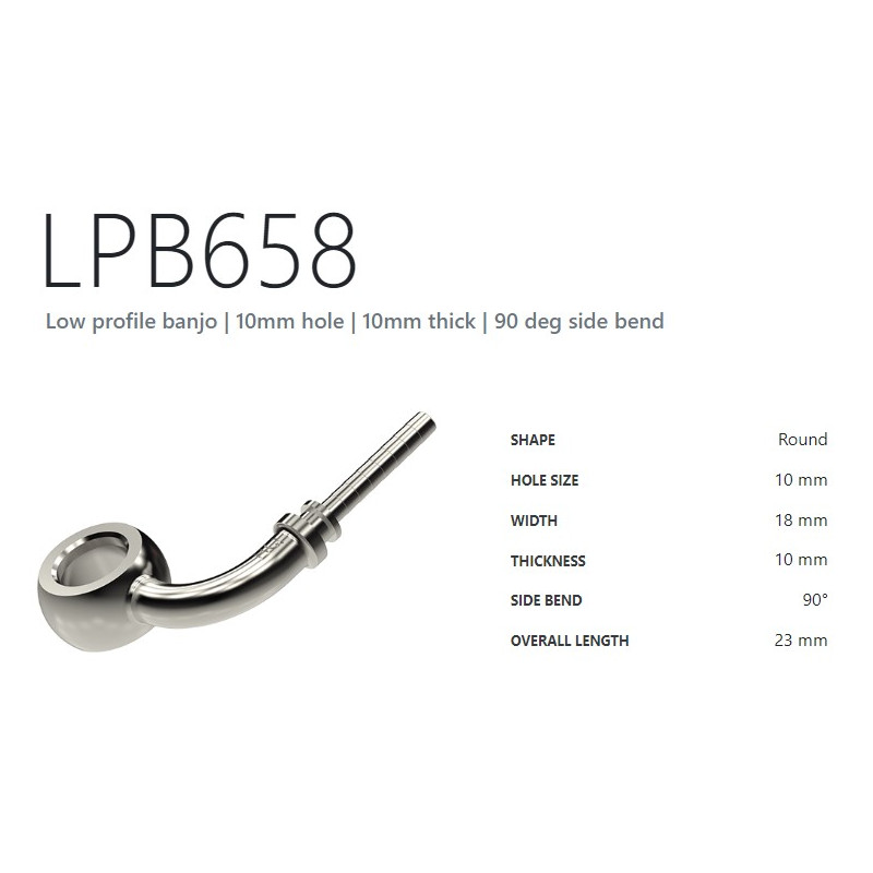 Oko pro použití s nerez. oplet. hadicemi. Otvor 10 mm. Šířka 20 mm. Výška 11,5 mm. Ohyb 10° Délka 52 mm.