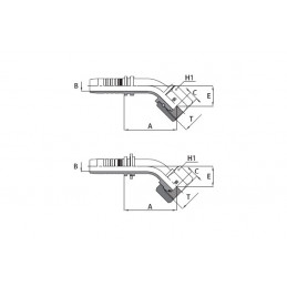 Hadicová koncovka DKJ 45° s převlečnou maticí se závitem typu UNF a vnitřním těsnícím kuželem 37° JIC. SAE J516/J514. Typ M22542 má matici zajištěnou drátem. Vhodná pro hadice: 1SN, 2SN, 1K, 2K, 1SC, 2SC, 1TE, 2TE, 3TE, EQUATOR, SHIELDMASTER, ROCKMASTER, LYTE-FLEX, COVER, SPIRTEX, MULTITEX, ASTRO, HARVESTER, PILOT, ETERNITY. Katalogové číslo: M22542 / M22543