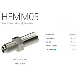 Koncovka rovná - vnitřní závit M12x1. Jednokus s objímkou. Klíč 21 mm. Obrácené sedlo. Délka 47 mm.