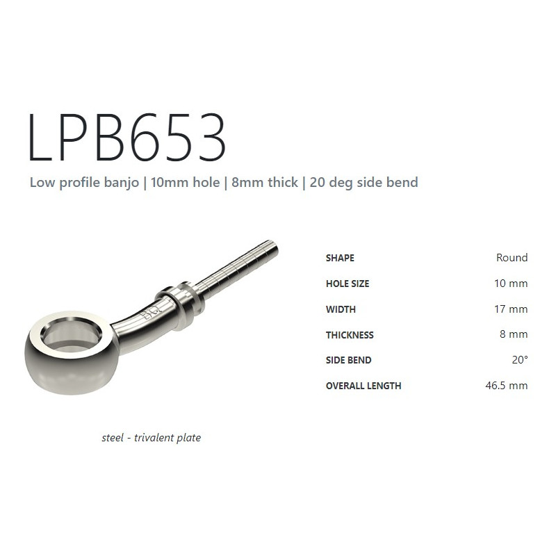 Oko pro použití s nerez. oplet. hadicemi. Otvor 10 mm. Šířka 18 mm. Výška 10 mm. Ohyb 90° do strany Délka 23 mm.